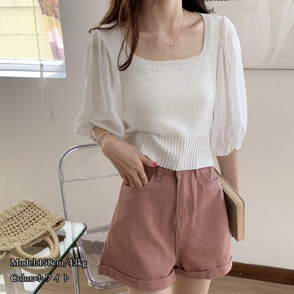ニットとシフォンスリーブが合わさったトップス