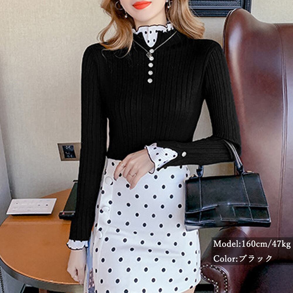 襟元と袖元のシフォンがポイントで、女性らしさを強調してくれるニットトップス