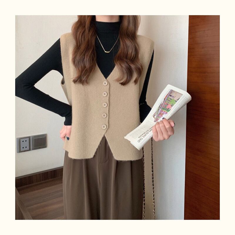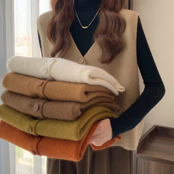 ニット ベスト 深いVネック ベスト シンプル ゆったり 体型カバー ふわふわ 大人 カジュアル 秋 冬 30代