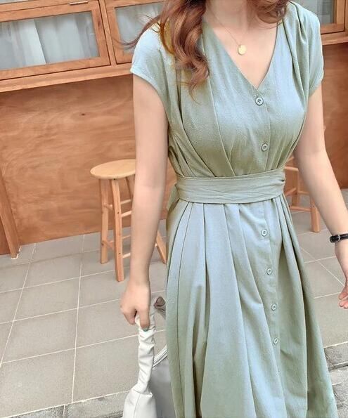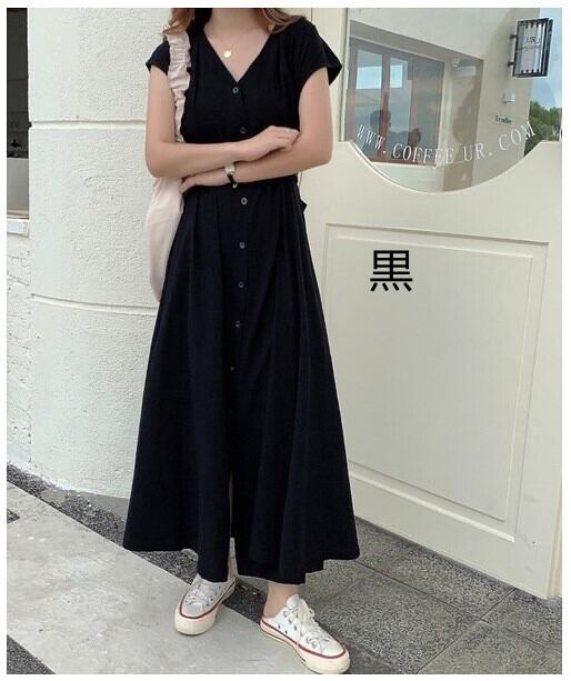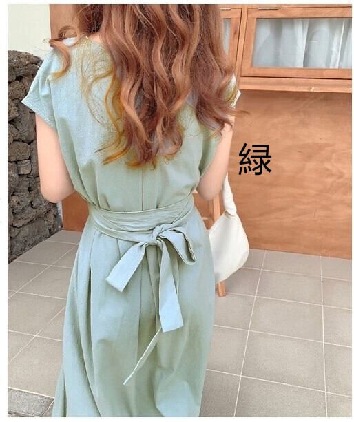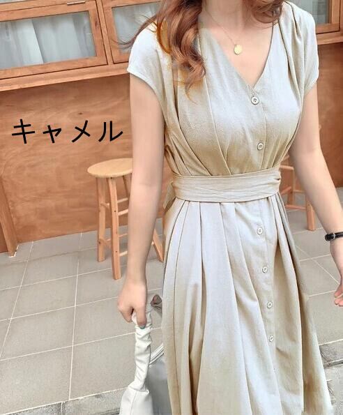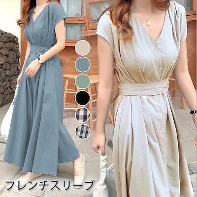 ボタン Vネックワンピース ロング フレンチスリーブシャツワンピース ウエストベルト マキシ丈ワンピース